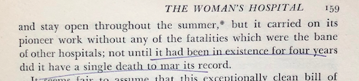 As appears to have been common, exact figures on the number of deaths at Woman’s Hospital are hard to gauge because of obfuscation and inconsistency on classification of the causes of death—in this case, Harris appears to have ignored the record of Bridget Headley’s death (see “…perform the operation anyway…,” above), and Maria Sharp’s death (see “…Maria Sharp…,” above) went ignored because it was judged that she had arrived too ill to be saved, as the Board of Lady Managers would put it (see below). The case record does not agree with that sentiment.